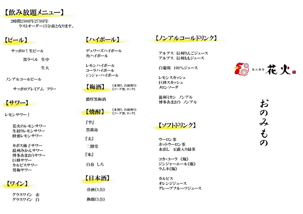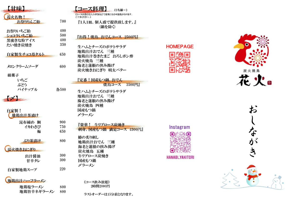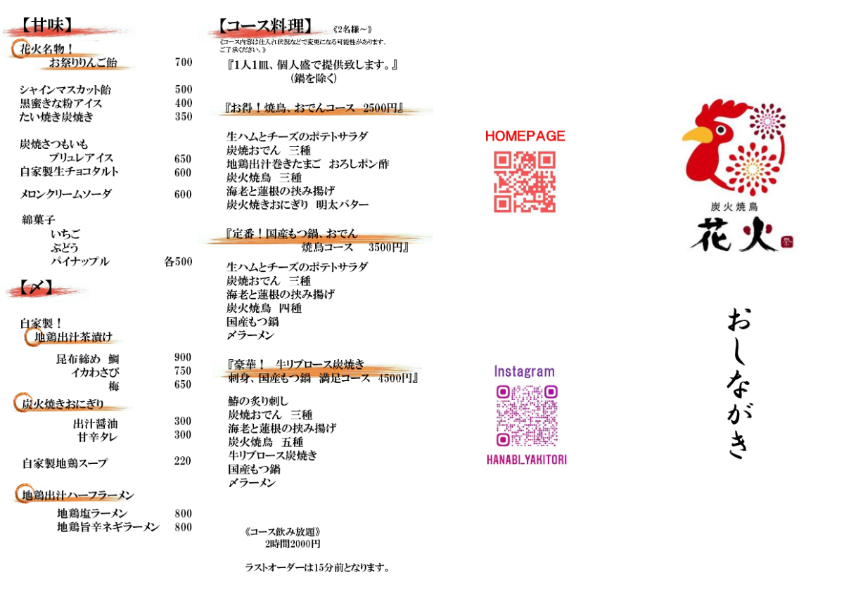 ディナータイム メニューのダウンロード お祝いプレート 「花火」では、花火・メッセージ付きの「お祝いプレート」をご用意しています。誕生日や記念日など、ちょっとしたサプライズを計画している方、お気軽にお電話でお問い合わせください♪ご要望にお応えしながら、2,000円~3,000円のご予算に合わせ、心を込めてお作りいたします! 最新情報はInstagramで発信中!↓↓ @hanabi_yakitori